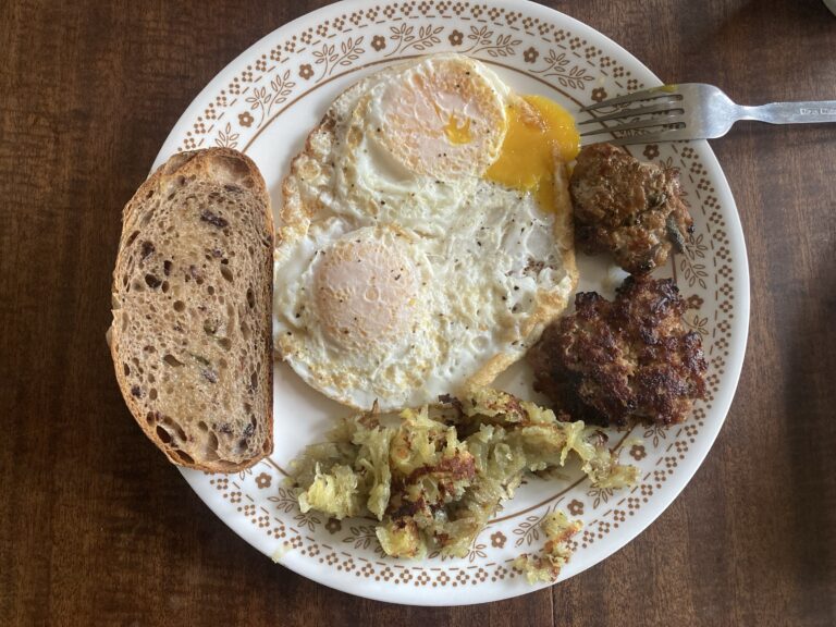 Breakfast for lunch, clockwise: Two Wild Edge eggs cooked over easy (Look how colorful those healthy yolks are!) Wild Edge ground pork, seasoned and formed into patties Satina Gold potatoes from Serendipity Farm, purchased at the PA Farmers’ Market Olive/rosemary sourdough bread from Shanivna, a new artisan cottage bakery featuring deliciously light sourdough breads One of…