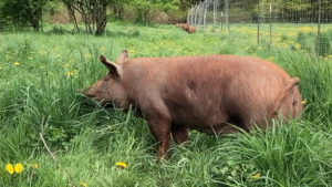 Pastured, regeneratively raised Tamworth hogs. These pigs are grazers first, rooters after. When we send them out to graze for an hour or so, they get right after the grasses and clover. Then, when it’s time these “Pastored” Tamworth hogs return to their winter pen in the hoop house.